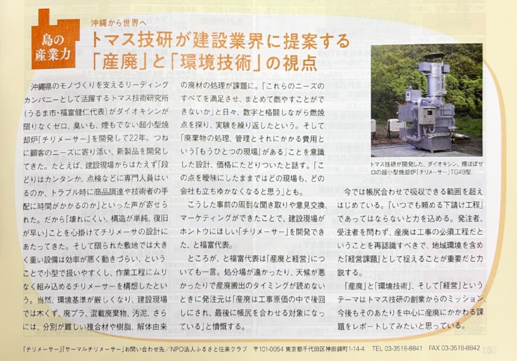 沖縄県のモノづくりを支えるリーディングカンパニーとして活躍するトマス技術研究所(うるま市·福富健仁代表)がダイオキシンが限りなくゼロ、臭いも、煙もでない超小型焼却炉「チリメーサー」を開発して22年。つねに顧客のニーズに寄り添い、新製品を開発してきた。たとえば、建設現場からはたえず「段どりはカンタンか、点検などに専門人員はいるのか、トラブル時に商品調達や技術者の手配に時間がかかるのか」といった声が寄せられた。だから「壊れにくい、構造が単純、復旧が早い」ことを心掛けてチリメーサの設計にあたってきた。そして限られた敷地では大きく重い設備は効率が悪く動きづらい、ということで小型で扱いやすくし、作業工程にムリなく組み込めるチリメーサーを構想したという。当然、環境基準が厳しくなり、建設現場では木くず、廃プラ、混載廃棄物、汚泥、さらには、分別が難しい複合材や樹脂、解体由来の廃材の処理が課題に。「これらのニーズのすべてを満足させ、まとめて燃やすことができないか」と日々、数字と格闘しながら燃焼点を探り、実験を繰り返したという。そして「廃棄物の処理、管理とそれにかかる費用という『もうひとつの現場』がある」ことを意識した設計、価格にたどりついたと話す。「この点を曖昧にしたままではどの現場も、どの会社も立ちゆかなくなると思う」とも。
