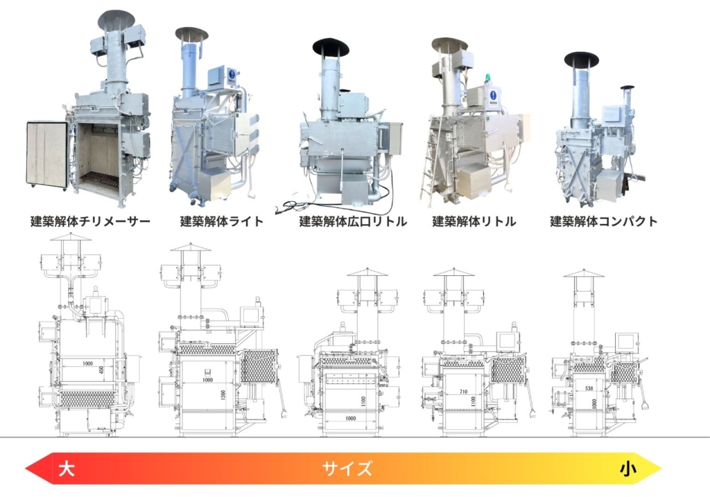 | 特徴 | シリーズ最大のサイズ | 建築解体チリメーサーと同じ種点検扉で、連続投入口は少し小さめ | 建築解体チリメーサーより主点検扉が若干小さめで、連続投入口は同じサイズ | 標準的なサイズ | シリーズ最小サイズ |